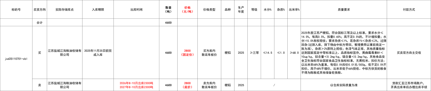 销售轮出的粮食为本次采购的在未来时点轮出的粮食,具体轮出时间详见线下协议,轮出价格为本次竞价产生,粳稻2800元/吨(2026年8-10月出库2300吨、2027年8-10月出库2300吨)(具体参见交易清单)。最终销售价=销售成交价-设定采购价+入库平均价格(如果最终销售价高于销售成交价,超出部分买卖双方签订补充协议线下执行)。