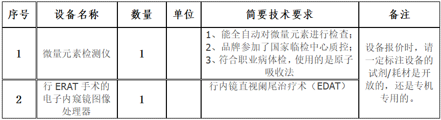******医院近期拟采购微量元素检测仪和行ERAT手术的电子内窥镜图像处理器等设备,现面向社会进行公开调研,诚邀符合条件的生产企业、经营企业以及潜在供应商来参加本次市场调研,为采购人采购提供技术参数、商务要求、最高限价等建议。